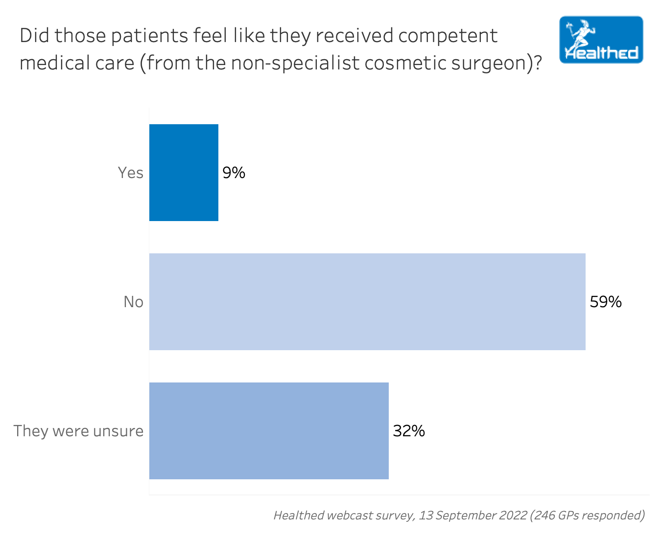 Around 59% of 246 GPs who answered Healthed’s survey question said the patients who had a bad outcome from non-specialist cosmetic surgery did not feel like they received competent medical care. (9% of GPs said patients in this situation thought they did receive competent care, and 32% of GPs said their patient was not sure.)
