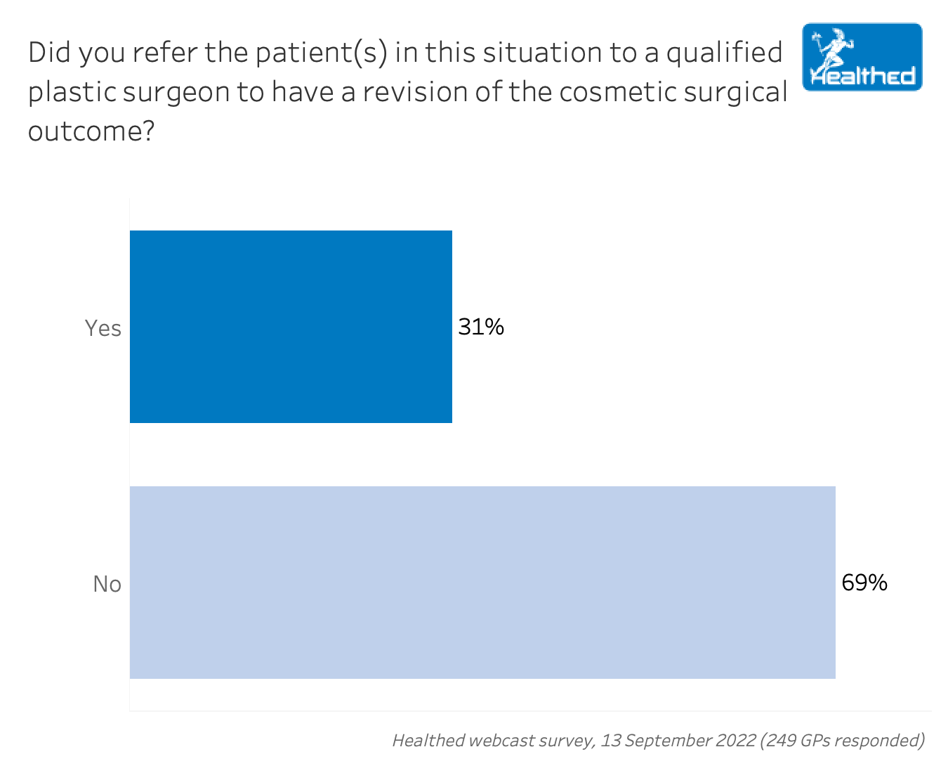 31% of 249 GPs who answered an additional survey question said they referred their patient to a qualified plastic surgeon to have a revision of the cosmetic surgical outcome.