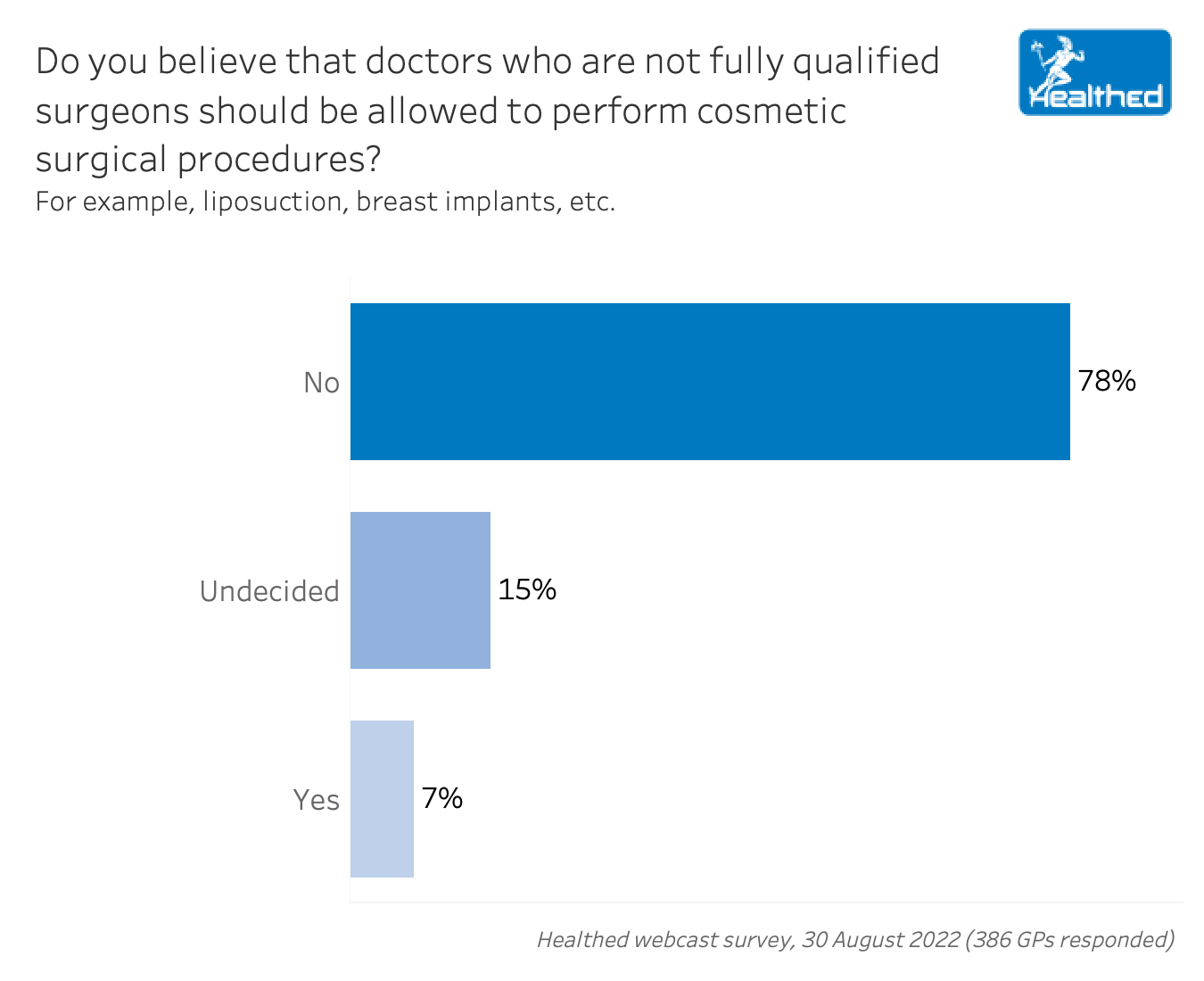 In a Healthed survey last year, 78% of GPs said doctors who are not qualified surgeons should not be allowed to perform cosmetic surgical procedures, such as liposuction and breast implantation.