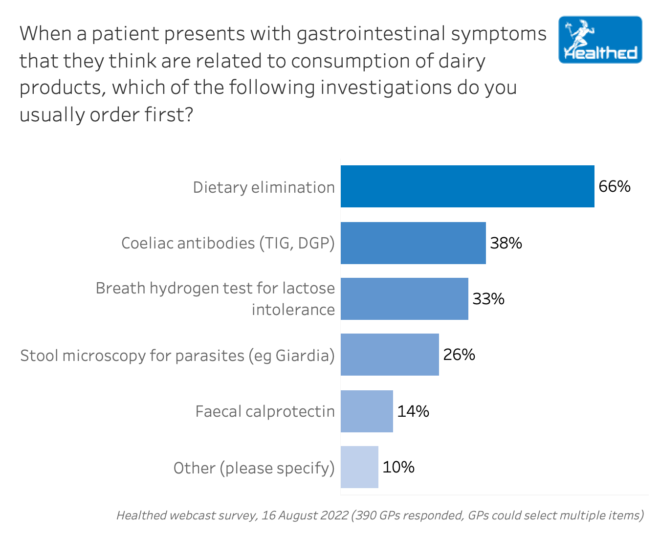 Food elimination and rechallenge is the gold standard to diagnose lactose intolerance, but a recent Healthed survey suggests that a third of GPs are recommending breath testing as the first point of call, according to accredited practicing dietitian Joanna Baker of Everyday Nutrition.