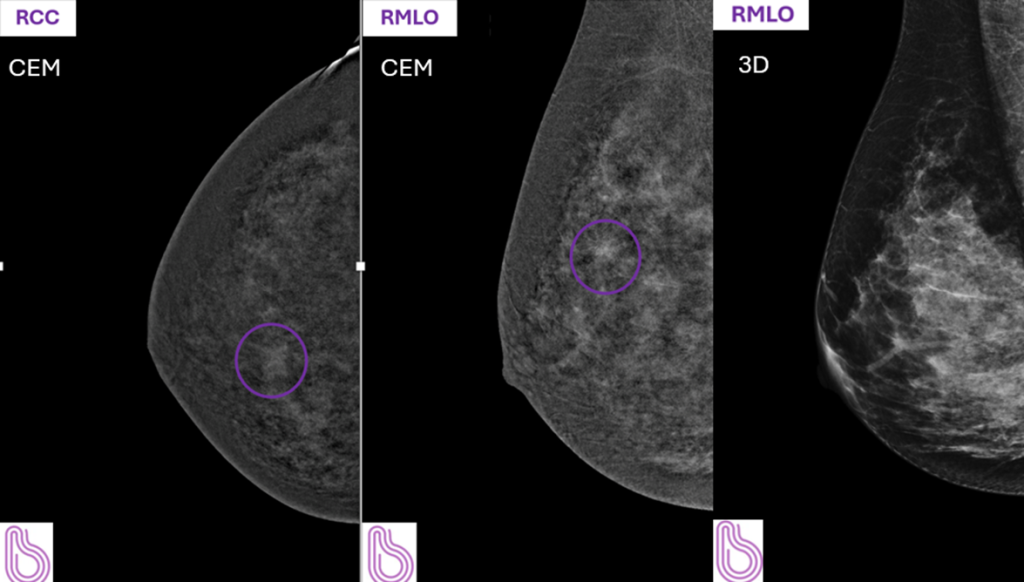 • Contrast enhanced mammography: CEM is more sensitive and specific than standard mammography2, particularly in women with dense breasts (BIRADS C or D), with high sensitivity approaching that of MRI, supporting its use as a cost-effective diagnostic and screening tool3. It has been demonstrated to help improve diagnostic accuracy in women with abnormal screening findings or symptoms of breast cancer4. Although the radiation exposure is slightly increased when compared to conventional mammography, it facilitates improved assessment of complex lesions that may not fulfil eligibility criteria for a Medicare-rebatable breast MRI.