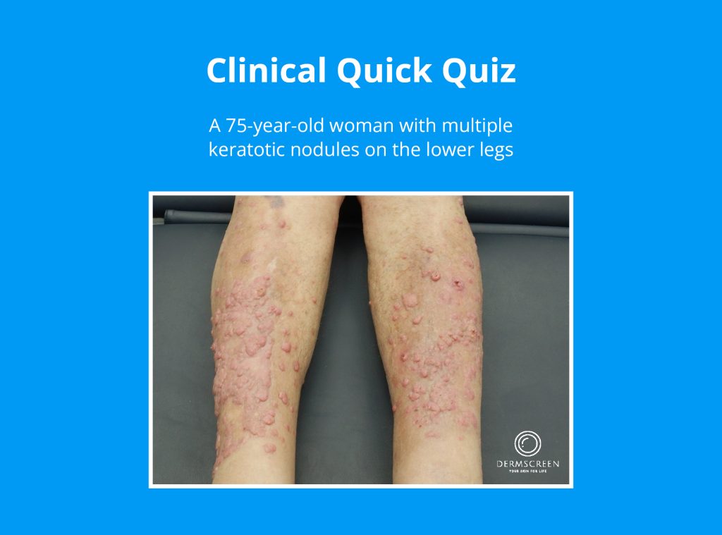 A 75-year-old woman with multiple keratotic nodules on the lower legs.