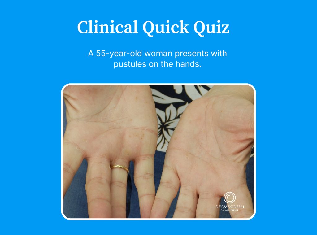 Articles / Clinical Quick Quiz – What is the most likely diagnosis for these pustules on the hands?