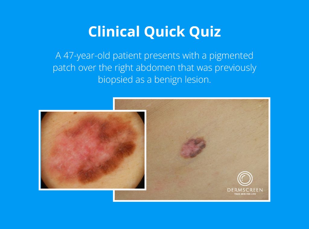 A 47-year-old patient presents with a pigmented patch over the right abdomen that was previously biopsied as a benign lesion.