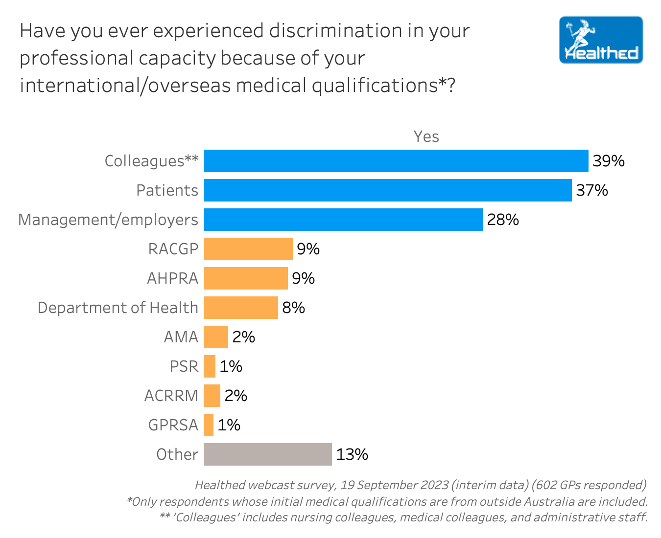 - 16% felt they had been discriminated against by organisations such as AHPRA, RACGP, the Department of Health etc