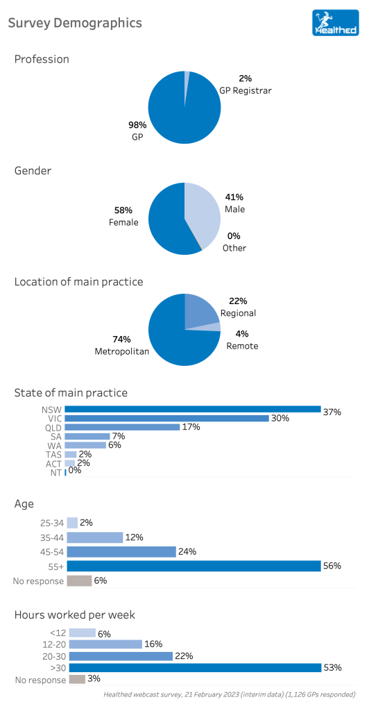 A total of 1,126 GPs responded to Healthed’s survey, which opened on 21 February 2023. GPs were allowed to skip questions, which is why each question has a different number of GP participants. Survey demographics are summarised in the charts below.