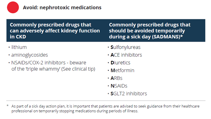 It’s particularly important to avoid nephrotoxic medications and ensure that patients know which ones to temporarily stop when they’re experiencing an acute illness.