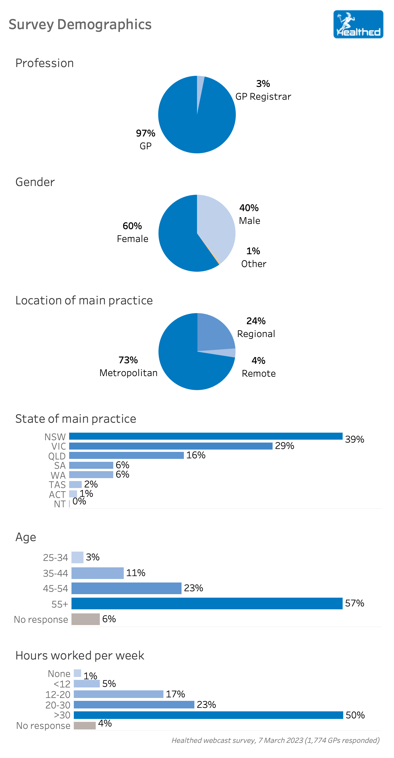 A total of 1,774 GPs responded to Healthed’s survey, which opened on 7 March 2023. GPs were allowed to skip questions, which is why each question has a different number of GP participants.