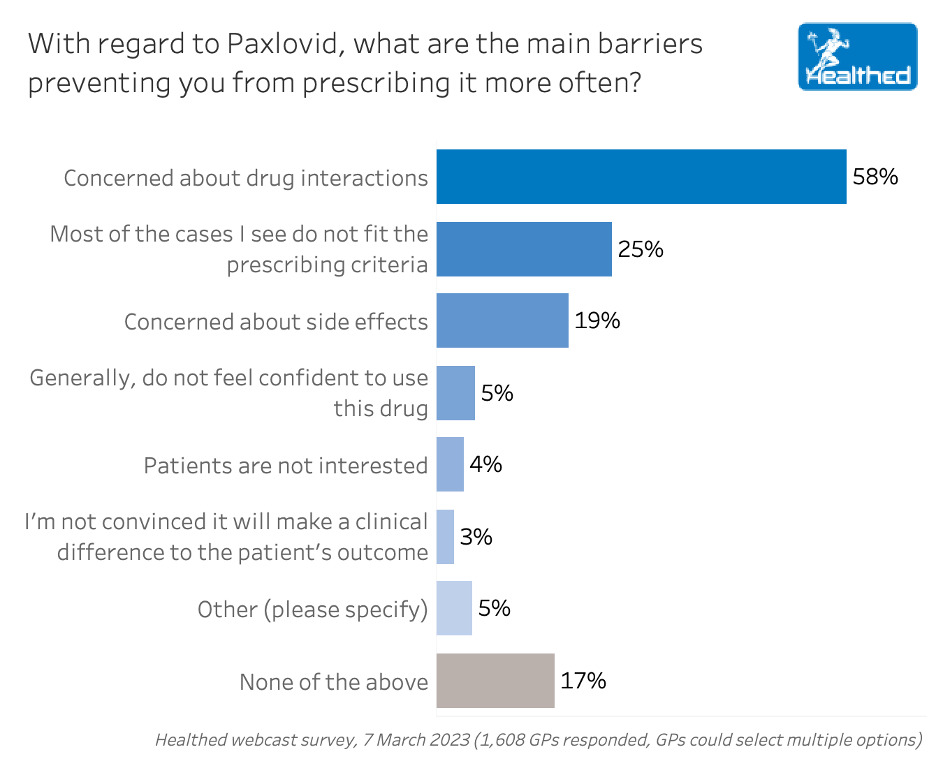 When Healthed asked GPs about barriers, 58% said concerns about drug interactions prevents them from prescribing Paxlovid more often. Almost one fifth of GPs (19%) said they are also concerned about side effects.