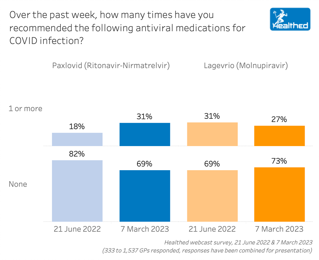 • In a survey of more than 1600 GPs, slightly more GPs (31%) had recommended Paxlovid to one or more patients in the past week, compared with 27% who had recommended Lagevrio.