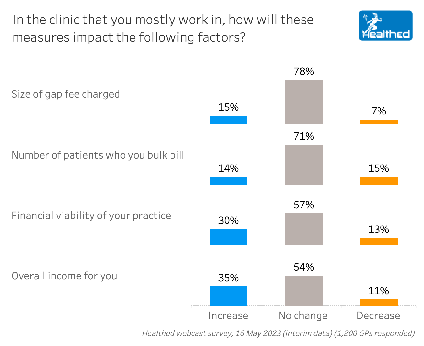 The vast majority of surveyed GPs said the budget measures would have no impact on the gap fee they charge or the number of patients they bulk-bill — though 15% of respondents said the size of the gap fee they charge will likely increase, and 15% expected the number of patients they bulk-bill to go down.