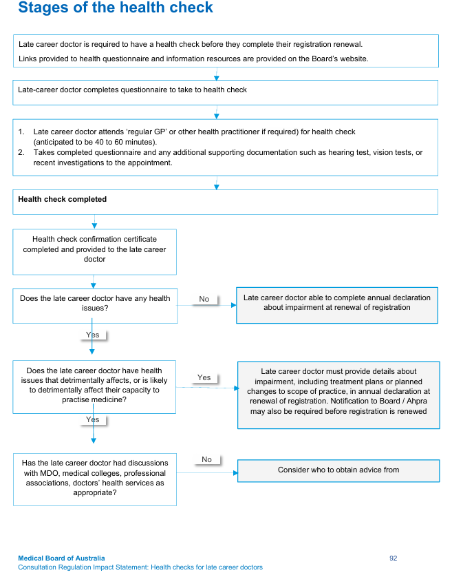 While the consultation period on assessments for late career doctors is still underway, the Medical Board has outlined their proposal in great detail in a “consultation regulation impact statement” that you can download from their website.