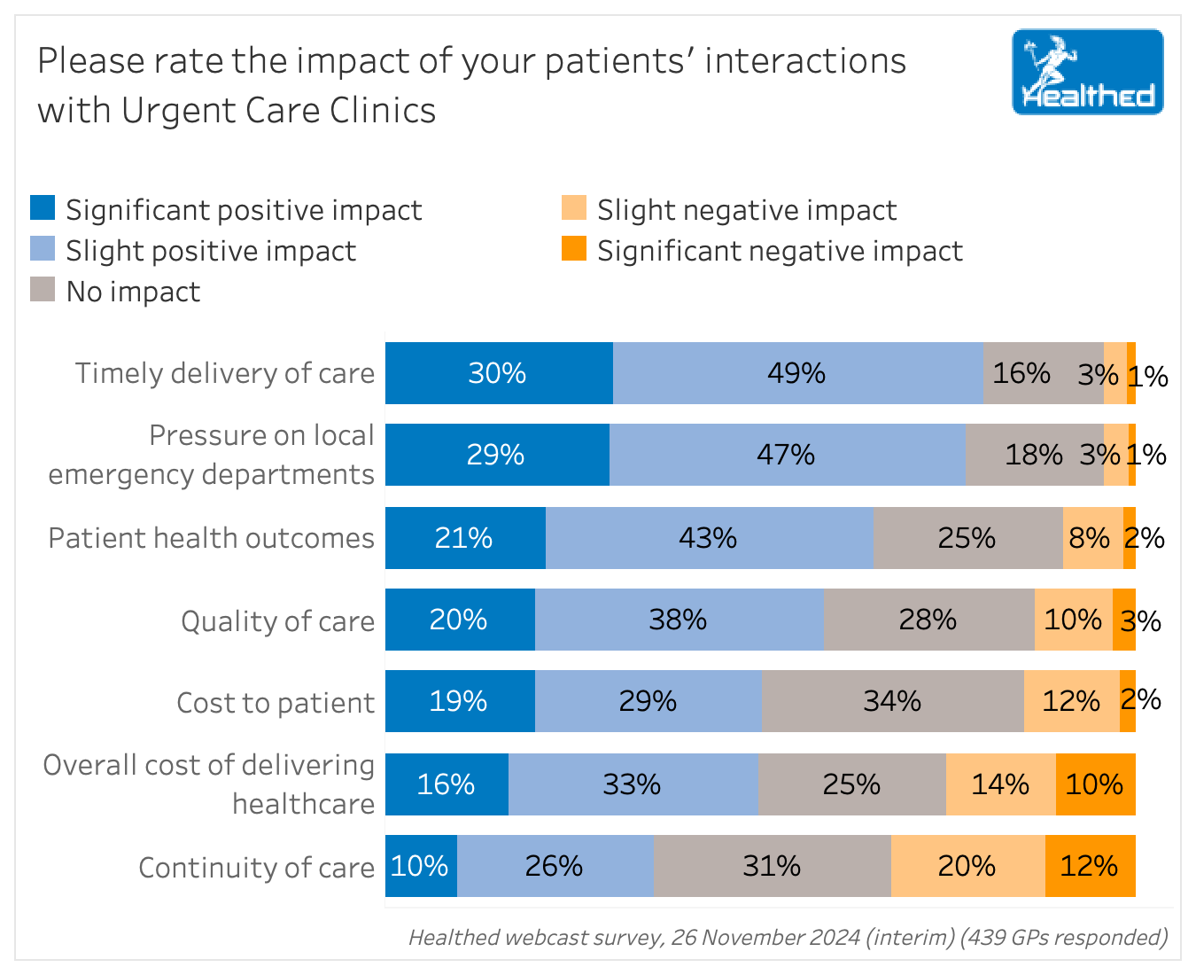 More than three-quarters of surveyed GPs with patients who had visited an urgent care clinic in the last month felt it had a positive impact on timely delivery of care and reduced pressure on local emergency departments, while 64% also felt it had a positive impact on patient health outcomes.