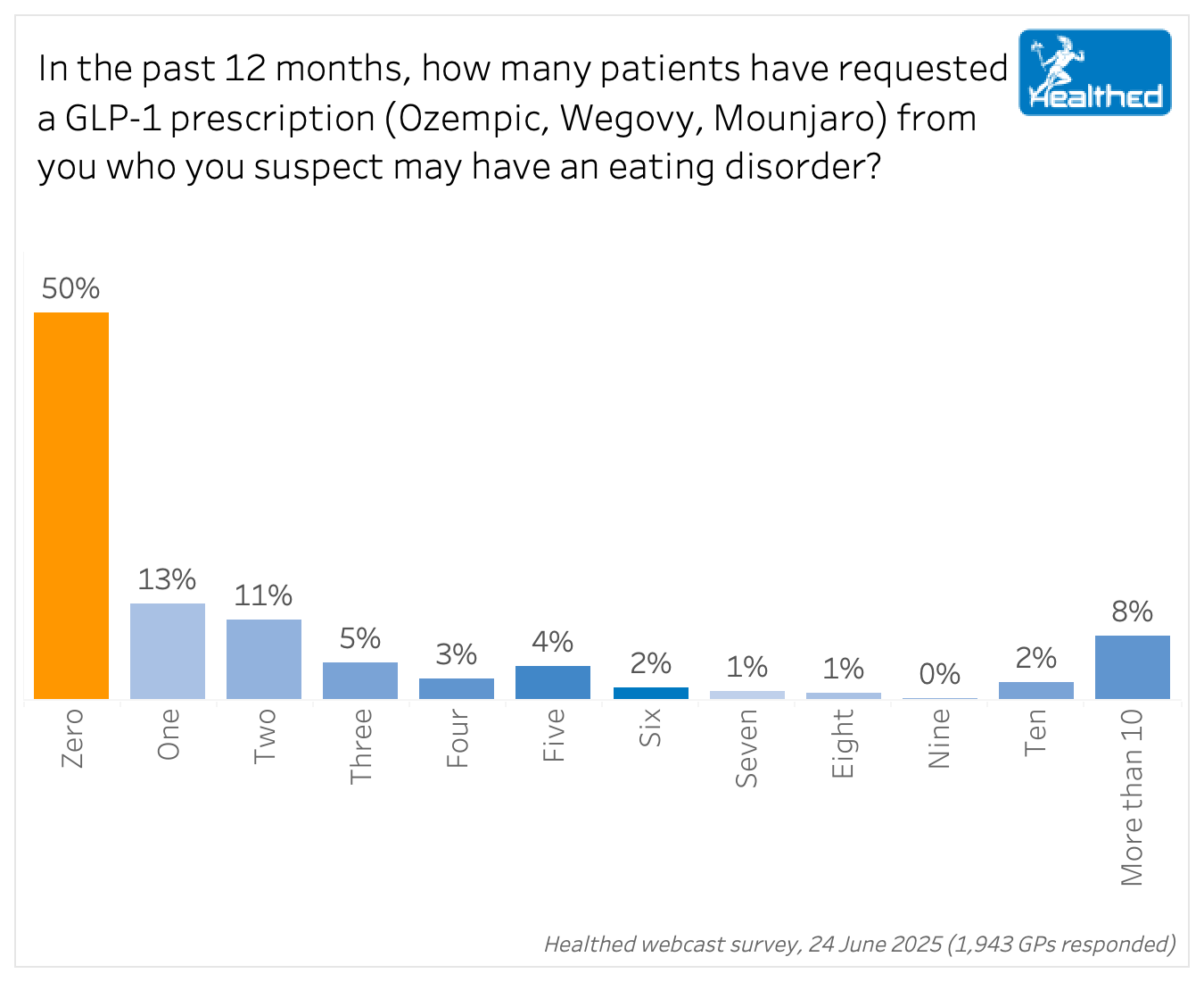 In Healthed’s survey, 48% of GPs reported seeing at least one patient they suspect may have an eating disorder who has asked for a GLP-1 prescription in the last year — including 8% who had encountered 10 or more such patients.