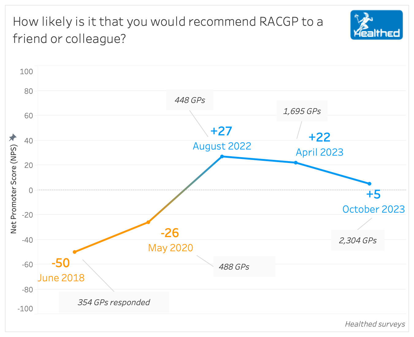 Healthed has been tracking the RACGP’s Net Promoter Score — one of the most common metrics businesses and organisations use to measure client satisfaction — since 2018.