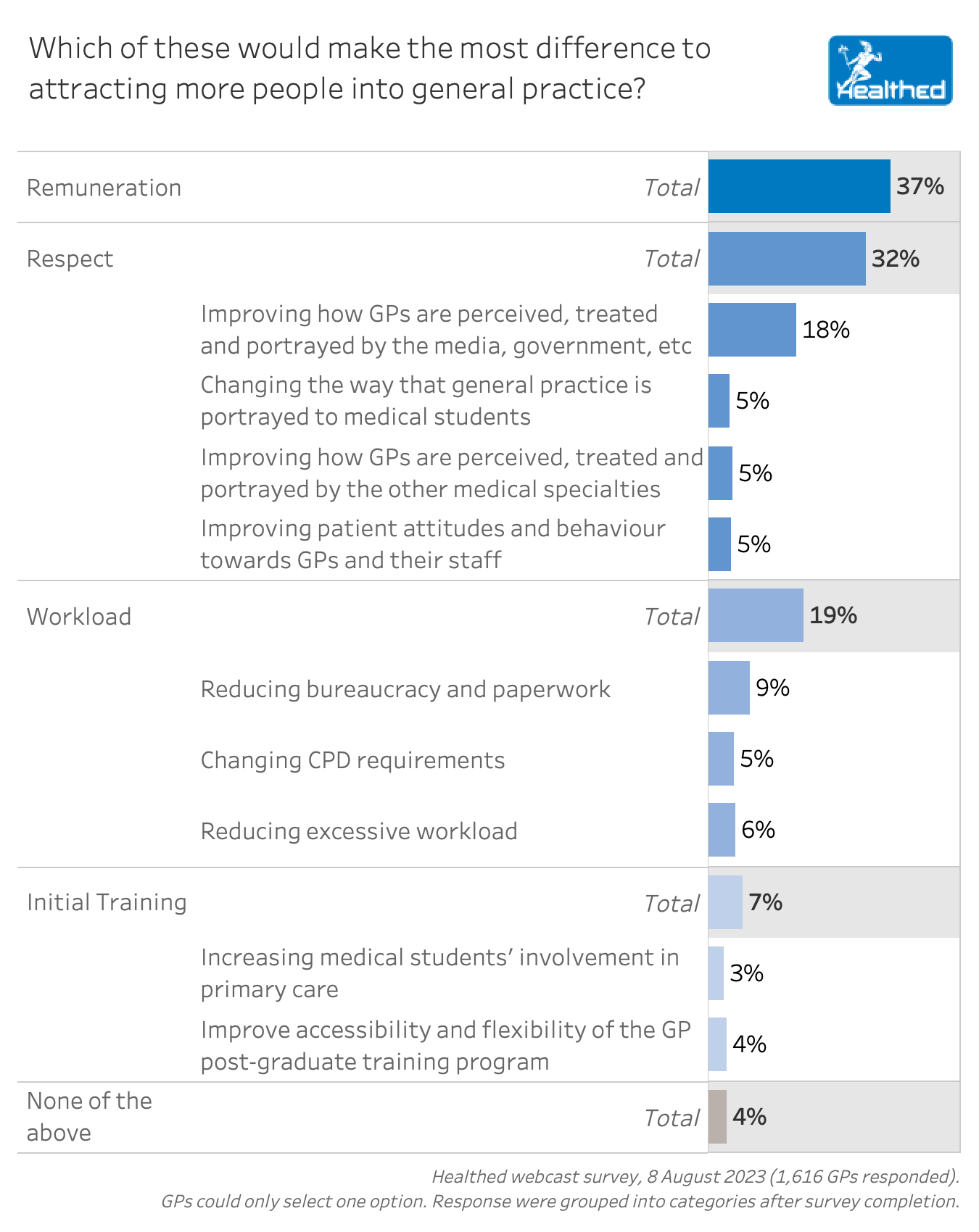 But about one third of survey respondents said improving the way GPs are perceived, portrayed and treated by the media, government, other specialties and patients was paramount.
