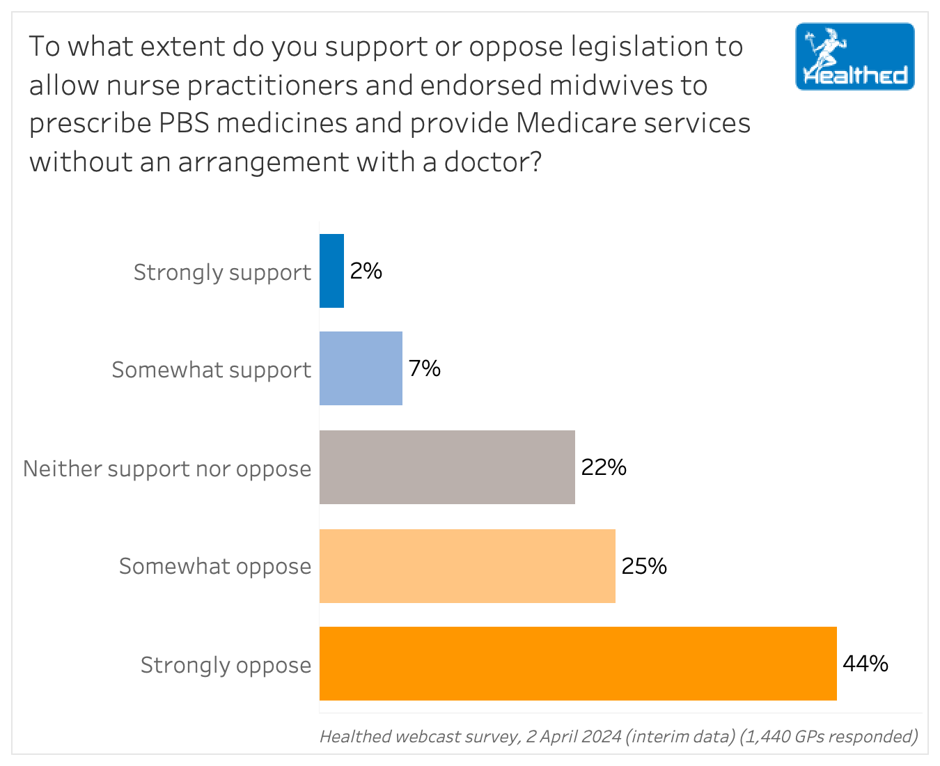 When asked directly for their views on the legislation that would allow nurse practitioners and endorsed midwives to prescribe PBS medicines and provide Medicare services without an arrangement with a doctor, 69% of GPs said they opposed it.