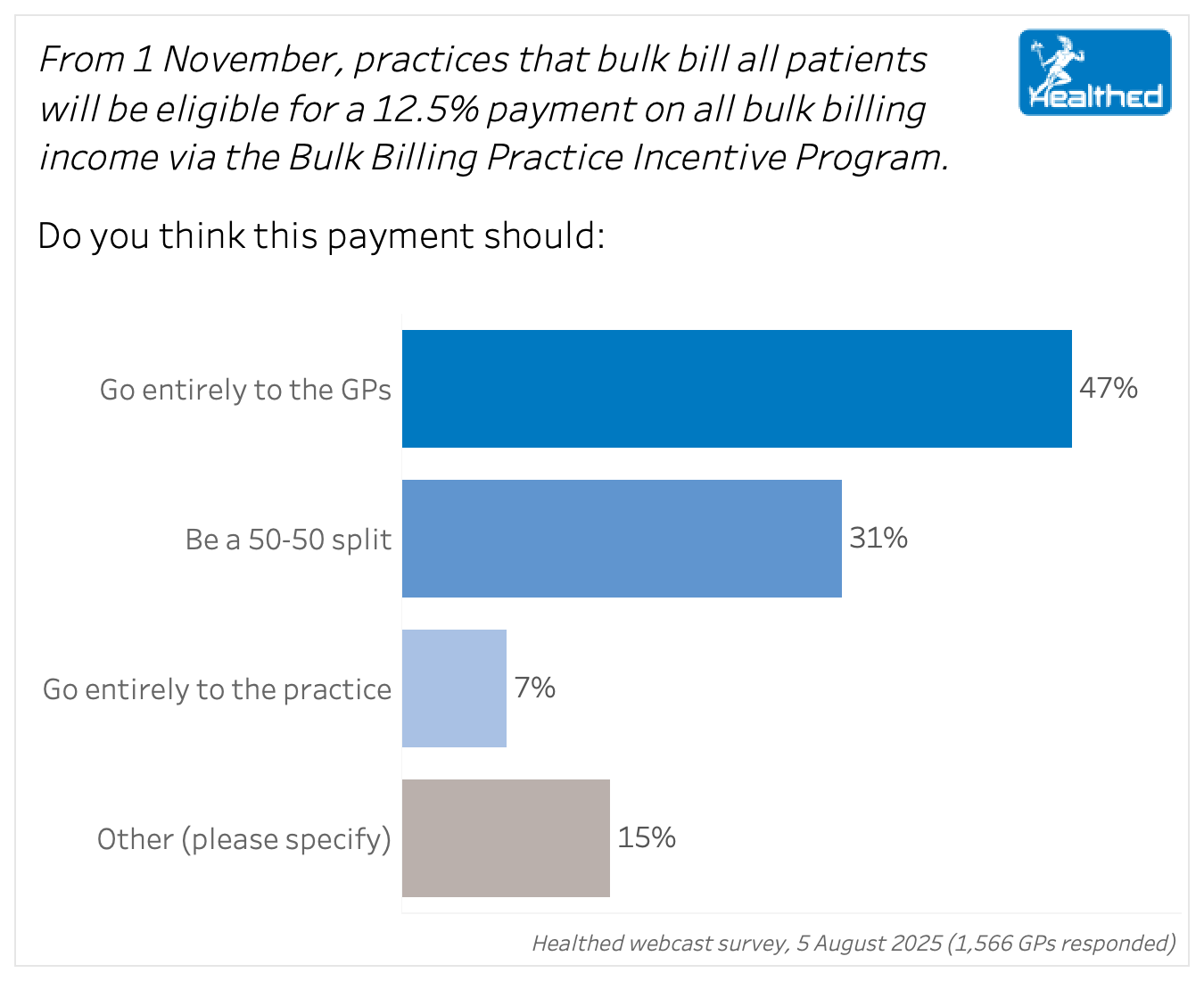 While less than half of over 1500 GPs in a national Healthed poll felt that GPs should get 100% of the new bulk billing PIP, just 31% thought it should be an even split.