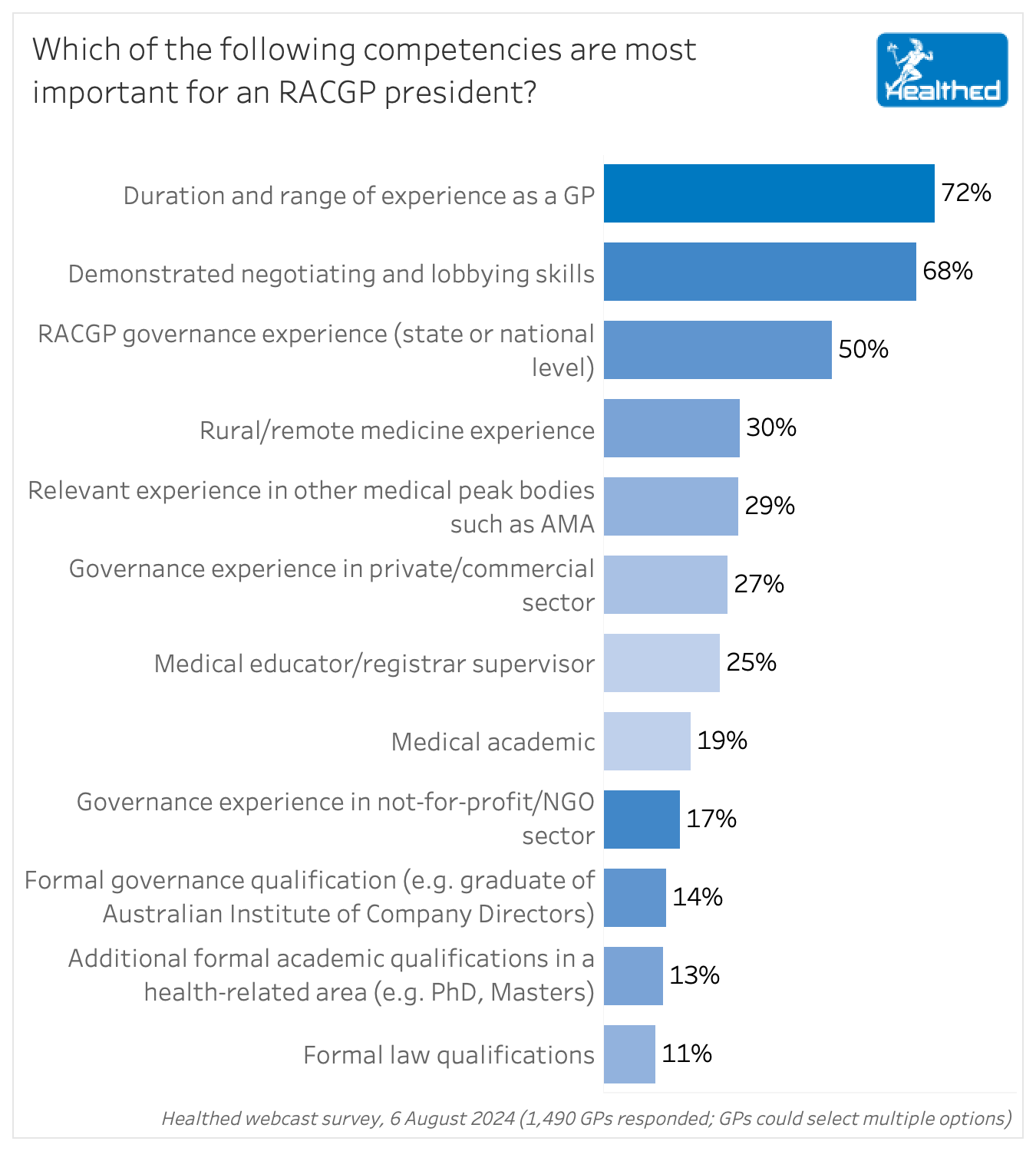 RACGP governance experience came third, but precisely half of respondents chose it, suggesting GPs are split on its importance.