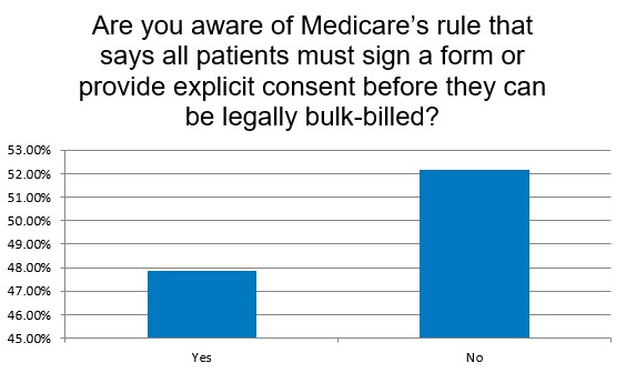 Take for example the Medicare rule that the patient must give explicit consent before they can be legally bulk-billed. Did you know that? If you didn’t you’re not alone. According to the online survey less than half of all GPs (47.92%) were aware such a rule existed.
